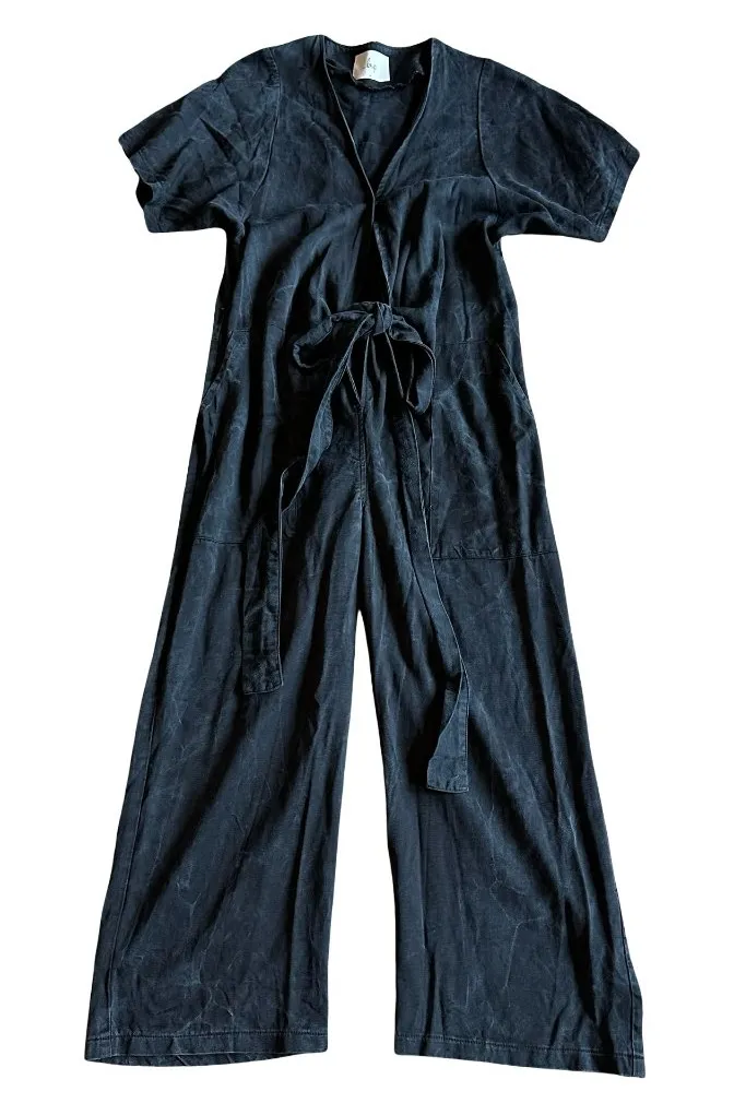 Loup Size XS Women's US Short sleeve jumpsuit in black and grey fabric V-neck; Belt that ties at wai... Show more