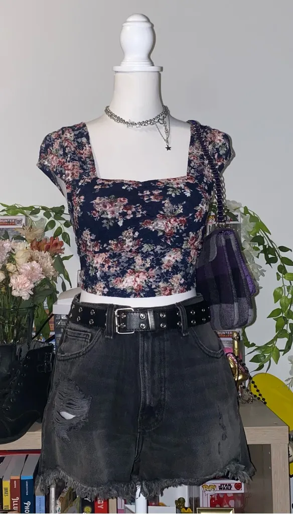 ♡✧゚ cute whimsical gothic fairycore floral print square neck crop top ✧・゚ ~ Size : Medium ~ Brand :... Show more