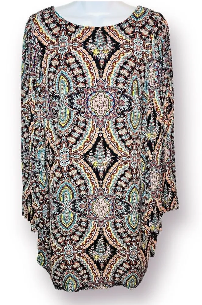 Love FIRE Pleated Wide Arm Shift Dress Mediterranean Stain Glass Print Medium Blue Multicolor. Exaggerated Wide Flowy Long sleeves flutter style with pleats. Shift silhouette. Mini length. Gently used Good preowned Condition. Easter Prairie, boho, Bohemian, Cottagecore, hippie, flower child, romantic, flowy, soft, feminine, girly, lacy, gypsy goddess ethereal, folk, shabby chic, rural, folklore, ethnic influences nomadic flair eclectic charm free-spirited vibe relaxed silhouettes vibrant hues work individuality wanderlust girlycore Career, office, work, professional, mature, sophisticated, business , careerwear,
