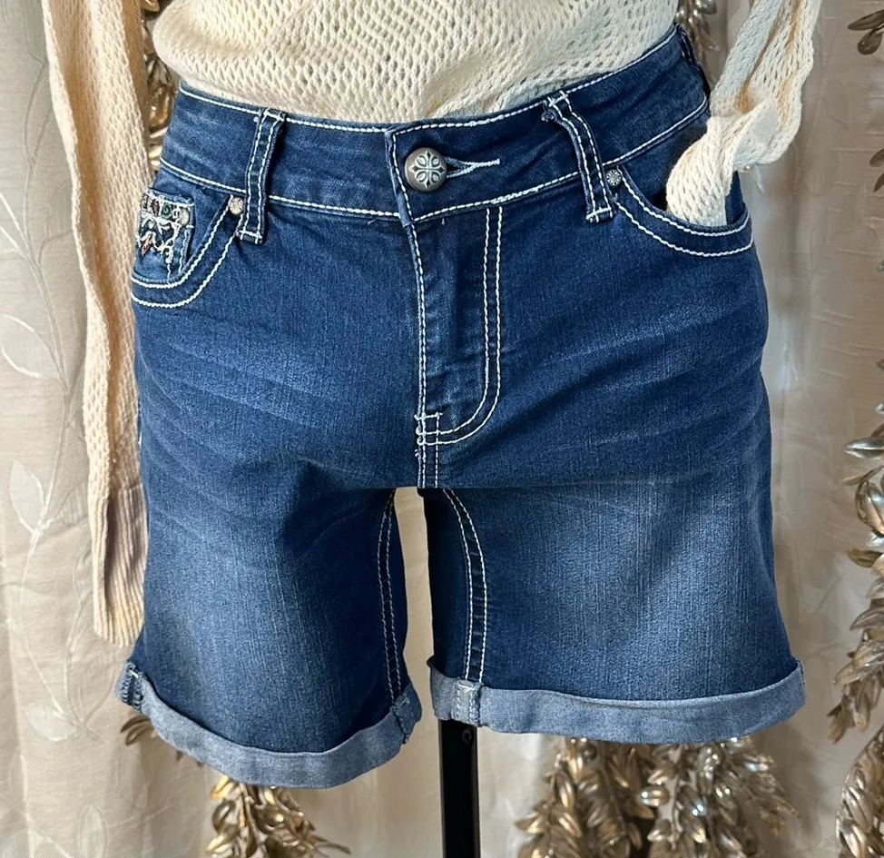 Love Indigo women’s size 6 denim shorts in a classic blue wash with white contrast stitching. Made from a comfortable blend of 53% cotton, 23% rayon, 22% polyester, and 2% spandex for added stretch and flexibility. These shorts feature beautiful embroidered details on the front coin pocket and back pockets, giving them a stylish, Western-inspired flair. The rolled hem adds a casual touch, while the mid-rise waist and traditional 5-pocket styling ensure a classic fit. Finished with a button and zip fly closure. Excellent pre-owned condition with no visible flaws. Measurements (approx., flat lay): • Waist: 14” • Front Rise: 8.5” • Back Rise: 10.5” • Hips: 17.5” • Inseam: 6.5” • Outseam: 14” • Thigh: 8.5” • Leg Opening: 9” Style Inspiration: Perfect for casual summer days, music festivals, and weekend getaways. The embroidered details add a boho-chic, Western-inspired touch, making these shorts easy to pair with flowy tops, graphic tees, or cropped tanks for an effortless, on-trend look. Additional Info: • Smoke & pet-free home • Cleaned with Tide & Downy • Ships within 1-2 business days • Open to reasonable price offers • Top & necklace sold separately • SKU: W173 #Hashtags: #DenimShorts #WesternStyle #SummerFashion #BohoVibes #EmbroideredDenim #FestivalStyle #CasualChic