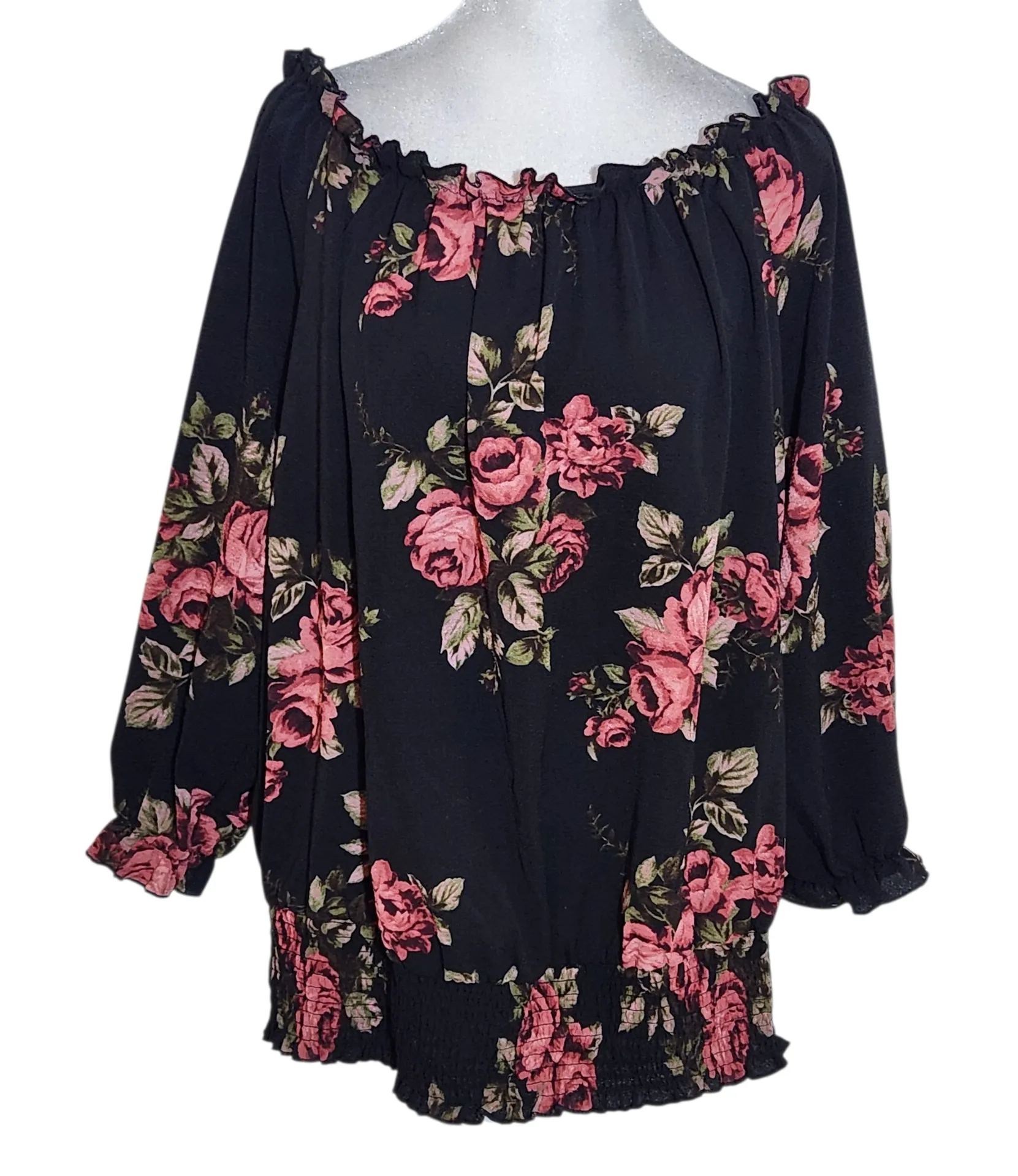 Love J black top with a beautiful floral design, smocking at the waist and end of the sleeves, and a style that can be worn off the shoulders. Depending on how the neckline is worn, it has 3/4 or long sleeves. Measurements are taken while laying flat and shown in images. Condition: used, great condition 2509-34