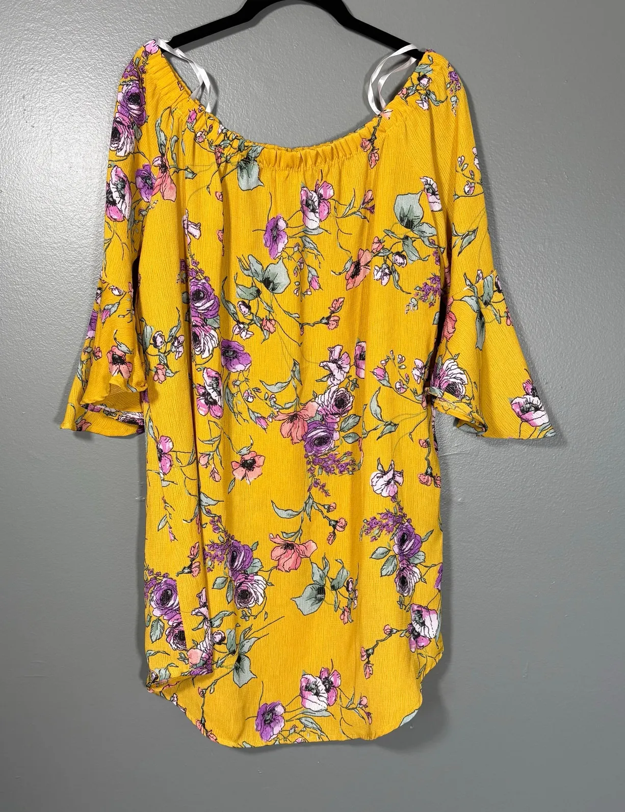 Women's boho off the shoulder dress by Love J. This cottagecore yellow floral dress has elastic at the neck, 3/4 length flared sleeves, and a scoop hem that hits near the knee. It is 100% polyester. The dress is a size medium. It measures approximately: Armpit to armpit: 21 inches Waist: 41 inches Length: 36 inches The dress is in amazing shape. There are belt loops on the dress, but no belt is included.