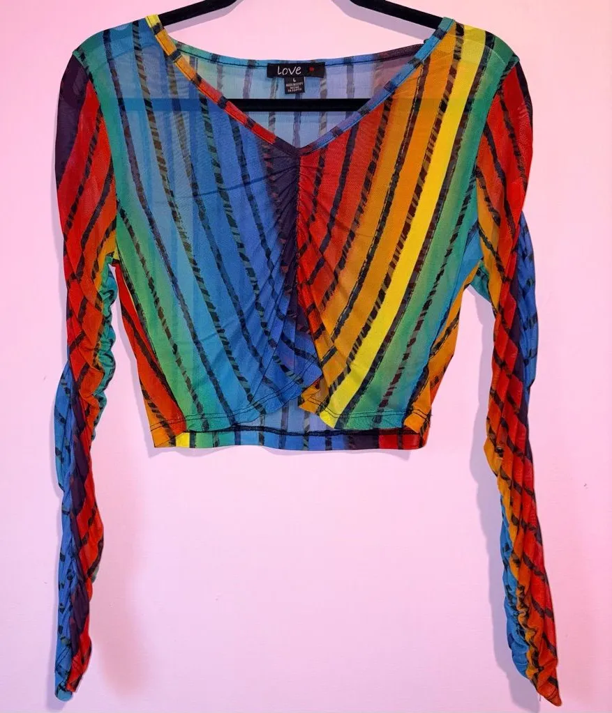 ed Features - v neckline - long sleeves - Cinched bodice and sleeves Excellent preowned condition Comment questions, I'm happy to help. All items are steam cleaned Check out my closet! Bundle & save Bold crop top with rainbow stripes. Eye-catching and trendy. Perfect for any occasion.
