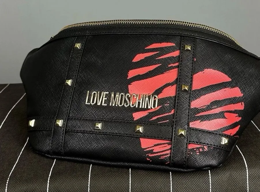 Chic Love Moschino belt bag with bold red accents. Features gold-tone studs and logo. Gorgeous, fun bag! NWT. Check my closet for more and take advantage of my shopping hobby!!!