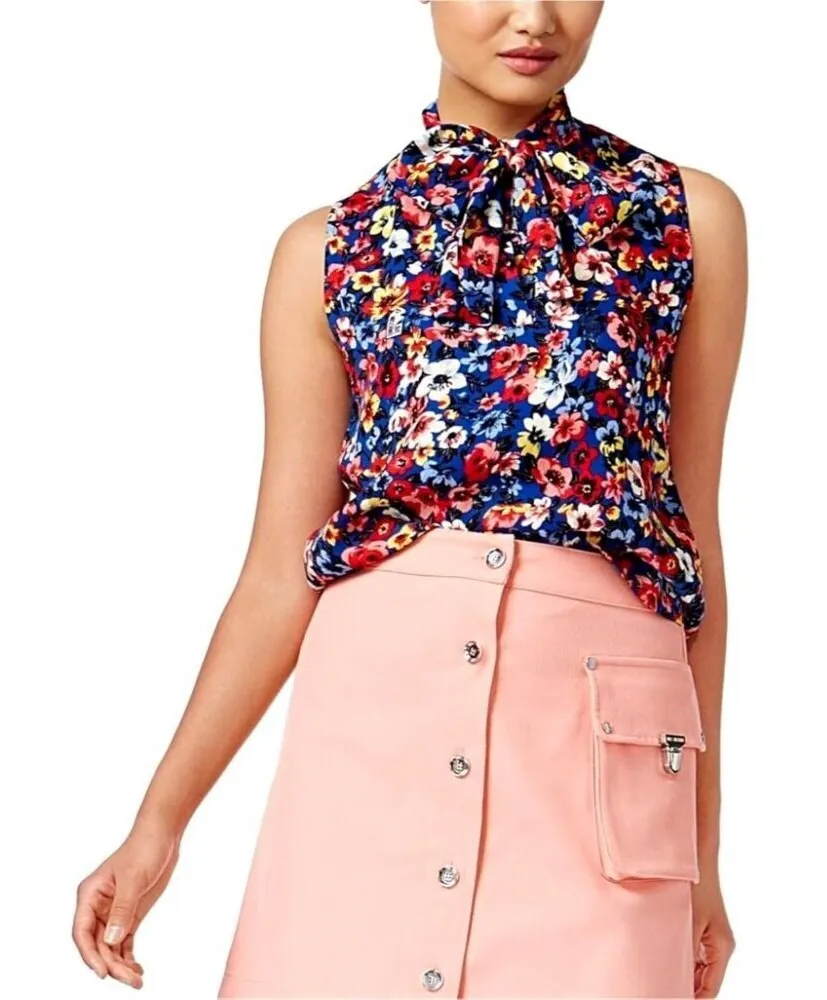 Elevate your wardrobe with this vibrant sleeveless blouse. Its bold floral design and charming bow d... Show more