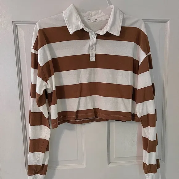 Striped long sleeve tee with polo collar, button-up detail, and cropped design. Ideal for casual outings, school, and everyday wear. Very comfortable and trendy. * In excellent used condition! * Brand • Love on a Hanger Size • Large / L (juniors) Type • T-Shirt Style • Cropped Color • Brown, White Size Type • Regular Department • Women, Juniors Sleeve Length • Long Sleeve Neckline • Collar Pattern • Stripes ⭐️ I SHIP SAME OR NEXT DAY ⭐️ ( excluding Sundays & Holidays )
