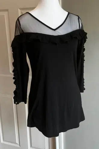 Top is in Excellent Condition Color: Black Type: Blouse Department: Women Style: Tunic Material: Rayon, Polyester, Spandex Neckline: V-Neck Sleeve Length: 3/4 Sleeve Sleeve Type: Classic/Fitted Sleeve Accents: Ruffle Pattern: Solid Features: Mesh Yoke, Ruffle Trim, Off Shoulder, 3/4 Sleeve Fit: Regular Keywords: Love Scarlett, Black Top, Ruffle Blouse, Off Shoulder Top, Mesh Yoke, 3/4 Sleeve Top, Elegant Blouse, Date Night Top, Cocktail Blouse, Womens Top, Blouse, Party Top Thanks for Looking!