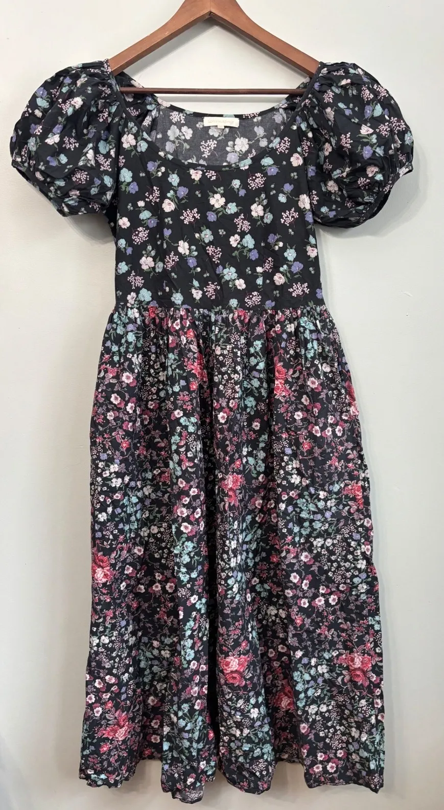 LoveShackFancy midi dress featuring a black background with a vibrant floral print. This dress showc... Show more