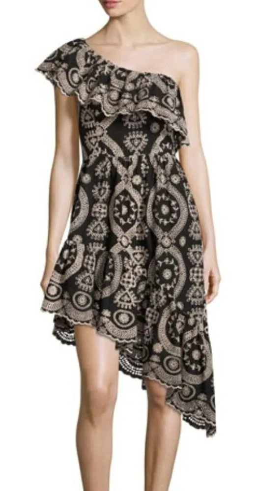 LoveShackFancy Black & Cream 100% Cotton Pamela Asymmetric One Shoulder Flounce Dress Size S