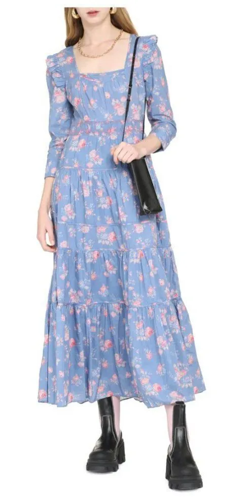LoveShackFancy Lyna Maxi Dress Women's In Blue Size Zipper Elastic Smocking Waist Ruffled Shoulders... Show more