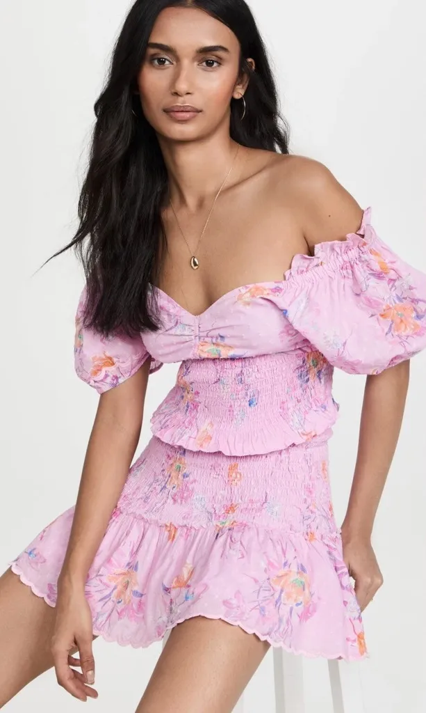 Charming pink mini dress with floral pattern. Features off-shoulder (or on) design and ruffled hem.... Show more