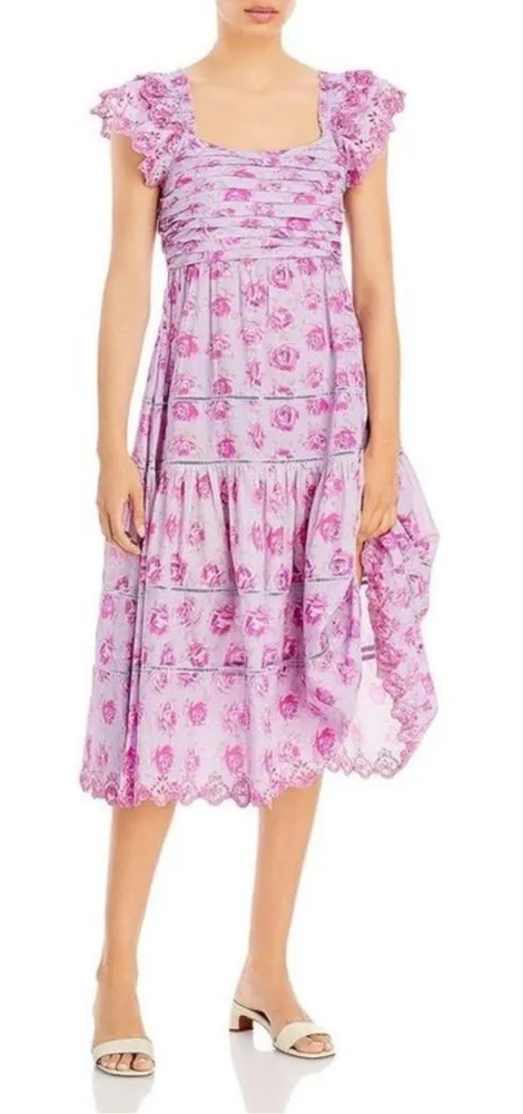 LoveShackFancy Womens Harlyn Purple Floral Pleated Tiered Midi Dress Excellent condition Size 2