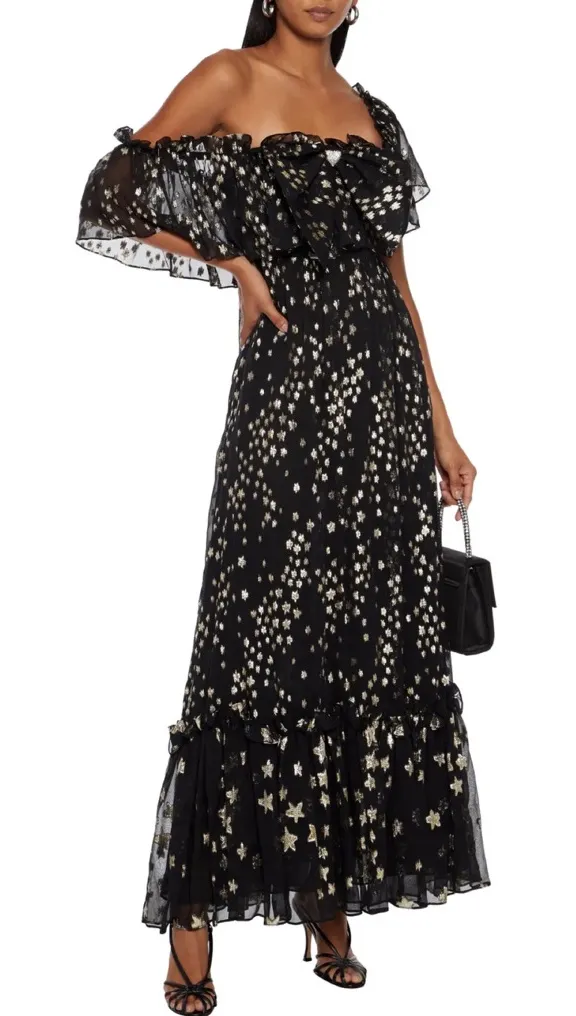 Dusted with shimmery gold stars, this elegant, flowy maxi is sure to dazzle from weddings to black t... Show more