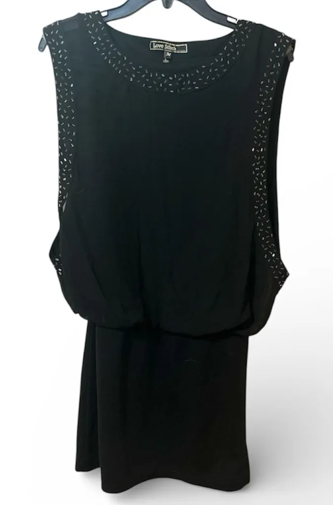Elevate your wardrobe with this stunning Love Stitch black beaded blouson dress or top, perfect for a cocktail party, special event, or evening out. This versatile piece features elegant beaded detailing around the neckline and shoulders, adding a touch of boho chic style. The comfortable, flowing design and blouson waist make it flattering and easy to wear. In like new condition, this size Medium dress is a must-have fashion staple. Approximate measurements (laid flat): Pit to Pit: 16" Length (shoulder to hem): 32" Shop this sleeveless, stylish black dress now and embrace that effortless California lifestyle look.