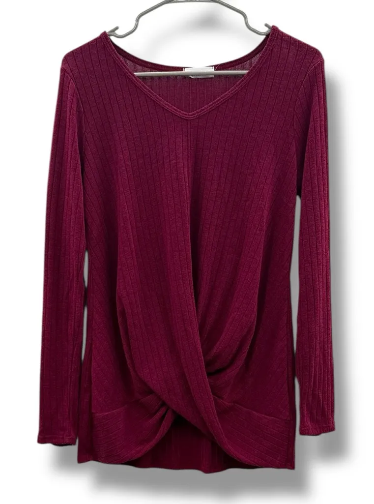Love Stitch First Love Burgundy Twist Blouse Size M Designed with a flattering twist front detail, it drapes beautifully to create a chic yet relaxed silhouette. The lightweight fabric offers comfort and breathability, making it a versatile top that can be worn year-round. The deep burgundy hue adds a touch of sophistication, while the twist accent gives it a modern and stylish edge. Ideal for both casual and dressy occasions, this blouse pairs seamlessly with jeans for an elevated everyday look or with trousers and skirts for a polished office or evening outfit. With its easy fit and timeless style, this Love Stitch blouse is a wardrobe essential that transitions effortlessly from day to night. Whether you're heading to brunch, the office, or a night out, this top delivers both comfort and style in one versatile piece. Long sleeves V neckline Twist front Pullover styling Solid burgundy color Ribbed knit No fabric/material tag Size: M Condition: Good, has some wash wear Tags: date night blouse casual friday office outfit brunch with friends look holiday dinner top girls’ night out attire fall family gathering outfit wine tasting trip style business casual meeting outfit polished weekday ensemble Thanksgiving dinner look stylish classroom outfit seasonal transition wardrobe piece dinner date blouse city stroll fashion casual networking event look spring or fall layered