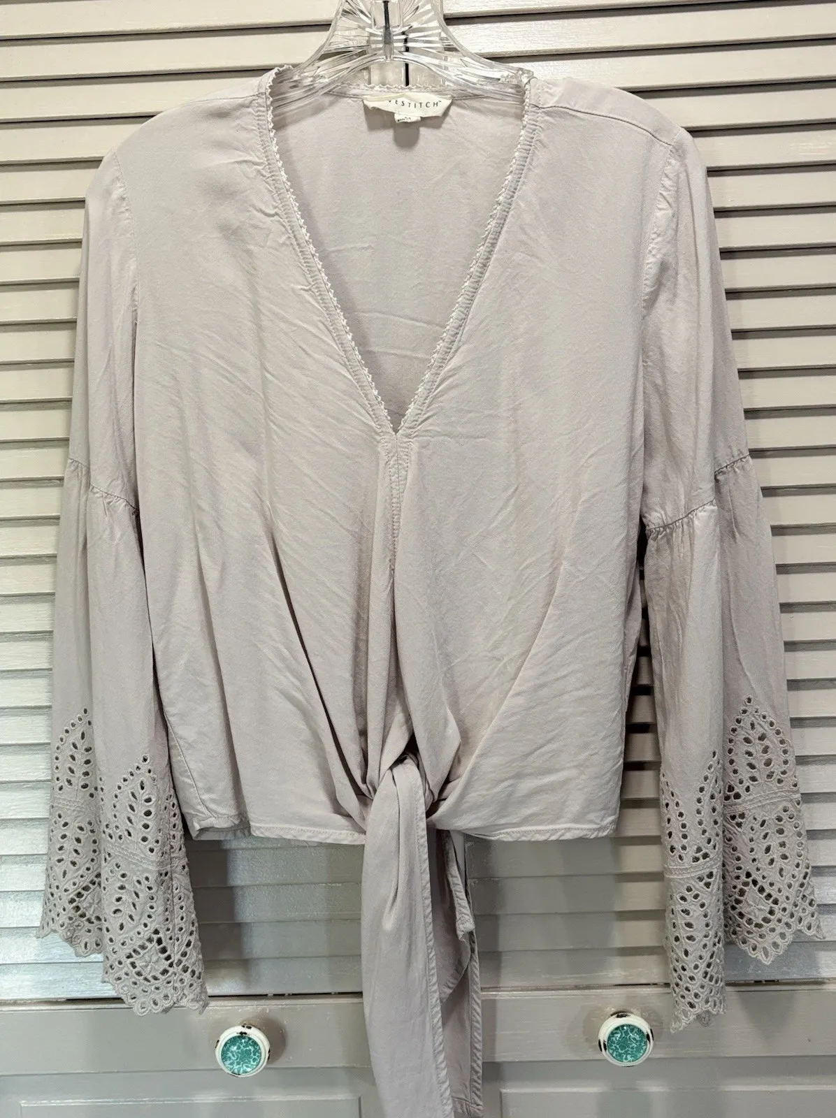 The Love Stitch Long Bell Sleeve Crochet Top in size M is a stylish and versatile piece perfect for various occasions including travel, parties, casual outings, and workwear. It is 19" pit to pit and a length of 20". This v-neck blouse features a unique tie waist design and crochet accents, adding a boho touch to the beige color. Made from a lightweight rayon fabric, this collarless top is breathable and suitable for all seasons with its long bell sleeves. With a regular fit and easy care instructions, this Love Stitch top offers both comfort and style for any fashion-forward woman. (2680)
