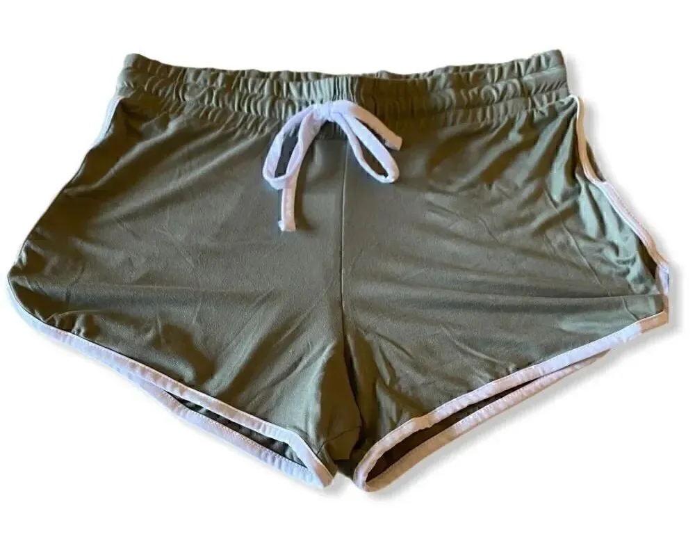 Love Streak Sporty Runner Shorts With Contrast Bind Size: L Measurements: waist 17 inches, length 13 inches Olive green with white vertical line Drawstring waistband Contrast trim Regular fit Machine washable 92% polyester, 8% spandex Smoke Free and Pet Free Color may differ depending on the device you use. Offers welcome