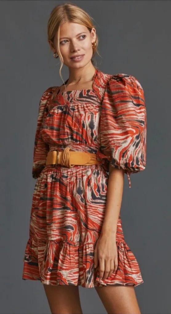 Good preowned condition Cotton Puffed sleeves Short sleeves Mini length Tiered skirt Ties at cuffs... Show more