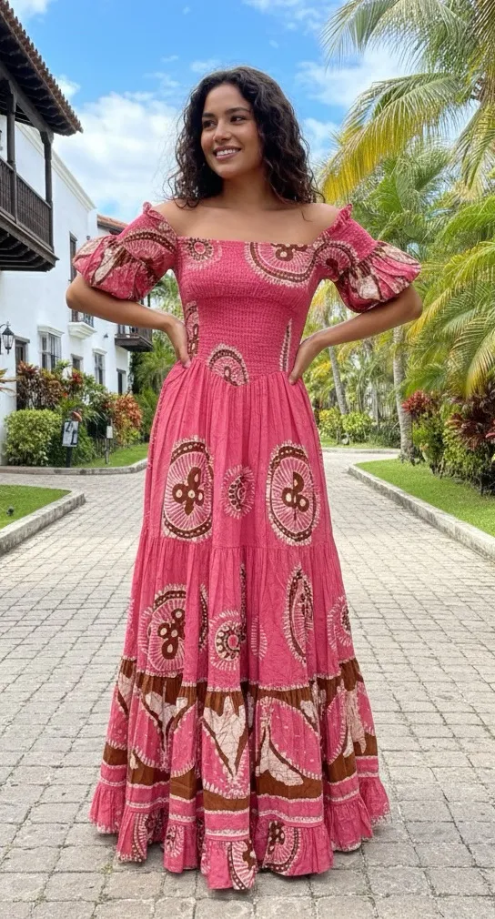 Love the label, Gigi, pink, print puff sleeve tiered, ruffle, maxi dress Size XS 100% cotton no lining Mannequin model from top of shoulder to floor 52 inches AI female model, for example, only not actual dress Love the label is a celebration of color, pattern, and playful individuality. The silhouettes are inspired by powerful women around us: their passion for their work & their loved ones