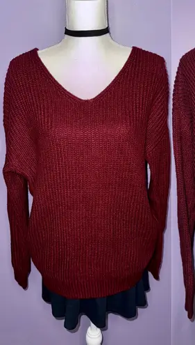 Stay cozy and stylish with this elegant burgundy sweater featuring a v-neckline and knotted open bac... Show more