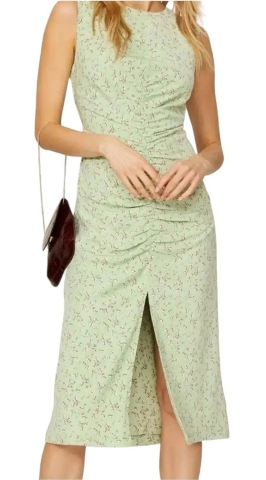 Love, Whit by Whitney Port green floral ruched midi dress Slit Open Back size large Featuring an open back, high center slit, and flattering ruching, this Love, Whit dress is a summer no-brainer. Green floral polyester blend (98% Polyester, 2% Spandex). Hourglass. Crew neck. Sleeveless. Tie closure in back 45" from shoulder to hemline. 15" slit. Pit to pit: 20" Waist: 19" Excellent Pre-Owned Condition (see pics for details) no flaws. Style Profile: luxury, Cottagecore, elegant, feminine, romantic, summer, wedding guest Smoke free/pet free home. All items are washed/sanitized with hypoallergenic detergent and come ready to be worn! Super Fast Shipping: I ship out the next business day.