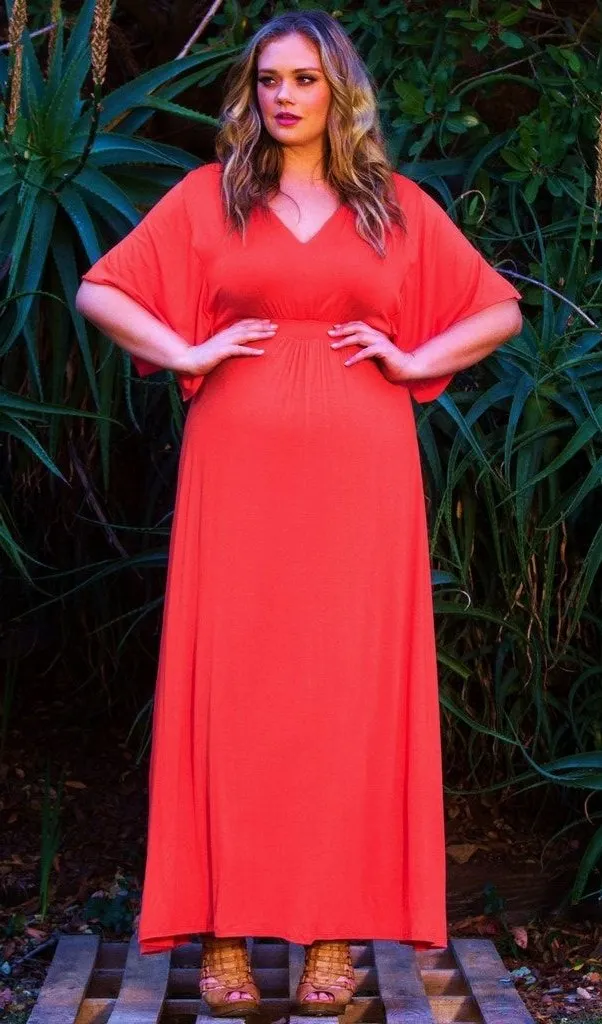 valentines, romantic elegance, soft, flowy feminine, modern classic, effortless chic Elegant Loveappella maxi dress in a bold red hue, designed with a flattering V-neckline and soft kimono sleeves for graceful movement. The stretch fabric drapes beautifully through the waist and skirt, creating a romantic silhouette that works effortlessly for special occasions, date nights, or elevated everyday wear. • Brand: Loveappella • Color: Red • Style: Kimono sleeve maxi dress • Fabric: Stretch knit • Fit: Size Medium