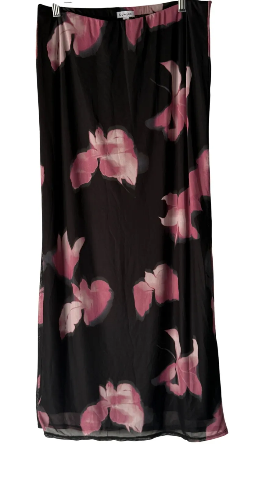 Elegant maxi skirt featuring a striking floral print. This skirt combines a sheer, lightweight fabric with a flattering silhouette, making it a versatile addition to any wardrobe. The pink floral pattern contrasts beautifully against the black background, creating a sophisticated and eye-catching design. The skirt is perfect for dressing up for an evening event, adding a touch of elegance to a casual brunch, or creating a stylish and comfortable vacation outfit. Measurements: • Waist: 15 inches • Length: 39 inches Type: Skirt Style: Maxi Skirt Length: Long Department: Women Pattern: Floral Material: Polyester Fabric Type: Chiffon Features: Elastic Waist, Lightweight Theme: Flower Closure: Pull On Rise: Mid Occasion: Party/Cocktail, Casual, Travel Keywords: Lovefire skirt, floral maxi skirt, sheer skirt, pink floral skirt, black maxi skirt, womens skirt, elegant skirt, bohemian skirt, long skirt, party skirt, vacation skirt, date night skirt, large skirt, L skirt