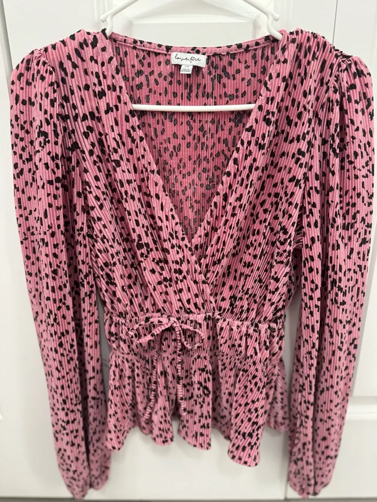 Elevate your wardrobe with this gorgeous LoveFire blouse in a playful pink leopard print. The V-neckline and ruffled accents create a feminine touch, while the long sleeves and elastic waist provide a comfortable fit. Made from high-quality polyester, this tunic-style top is perfect for any occasion. It is in excellent condition and has been well-maintained. Don't miss out on the opportunity to add this beautiful blouse to your collection.