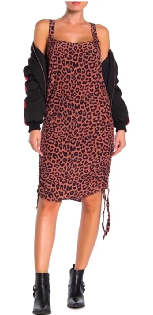 The dress features a leopard print, a square neckline with thick shoulder straps, ruched detailing a... Show more