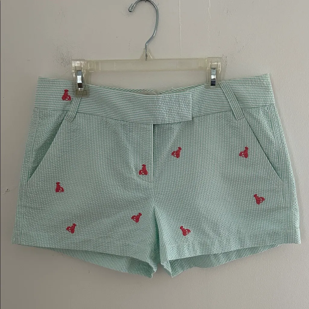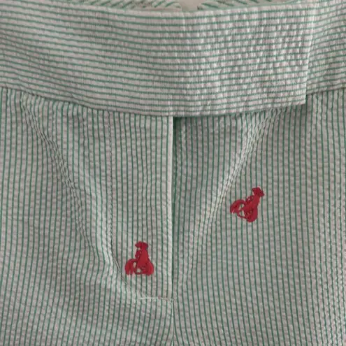 Darling mint green and white striped seersucker J. Crew city fit shorts with salmon embroidered lobs... Show more