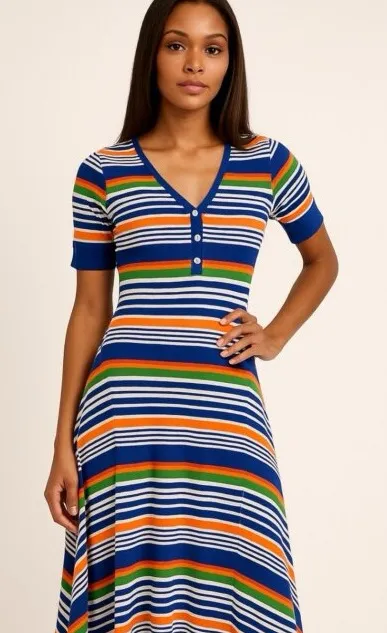 Elevate your style with this vibrant striped V-neck dress. Perfect for any occasion, this dress feat... Show more