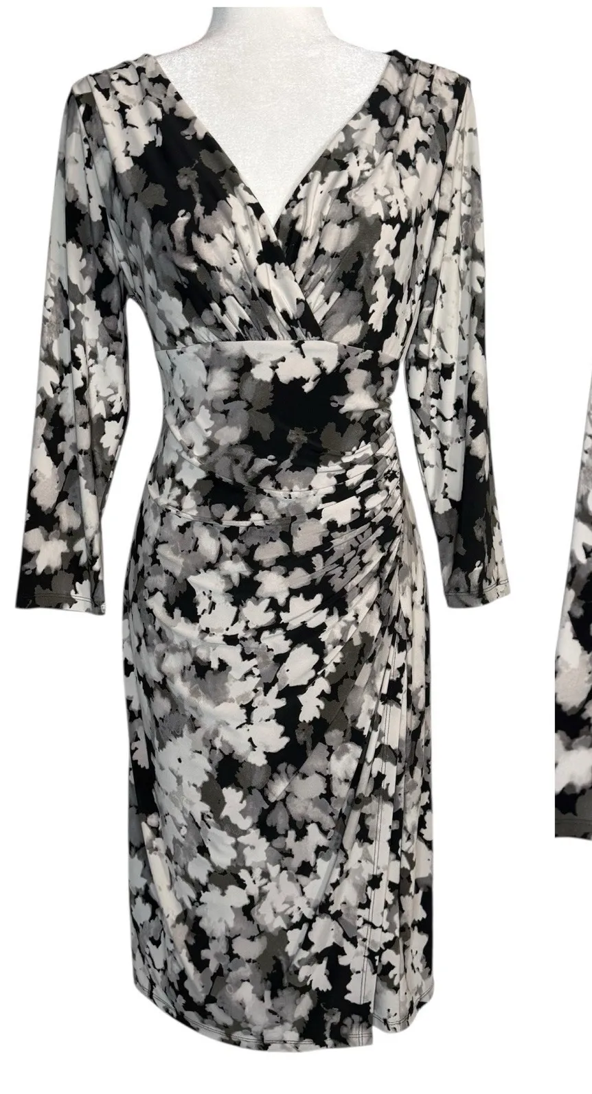 Elegant and flattering, this Lauren Ralph Lauren dress features a modern black, gray, and white abstract floral print in a slinky stretch jersey fabric that drapes beautifully over the body. Designed with a surplice V-neckline, shirred side detail, and faux wrap silhouette that enhances the waist for a timeless, feminine fit.