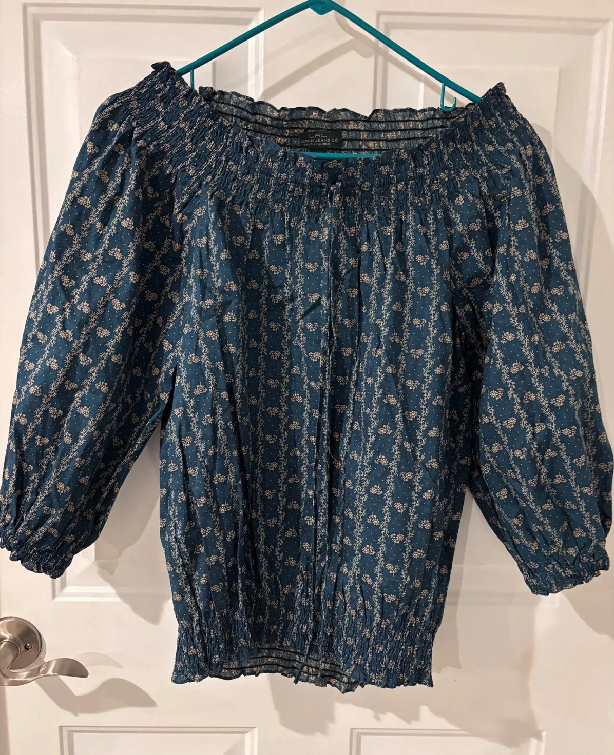 Catch the light in this enchanting LRL Ralph Lauren Jeans Co. smocked off-the-shoulder top. Delicate floral patterns in a captivating blue hue adorn this piece, creating a whimsical and feminine aesthetic. The smocked bodice offers a comfortable and flattering fit that accentuates your silhouette, while the voluminous puff sleeves add a touch of romantic flair. Effortlessly transition from a sunny daytime outing to a relaxed evening gathering with this versatile top. Measurements: • Bust: 38 in • Length: 17 in • Sleeve Length: 18 in Type: Blouse Department: Women Style: Off the Shoulder Material: Cotton Blend Neckline: Off the Shoulder Sleeve Length: 3/4 Sleeve Sleeve Type: Balloon Sleeve Pattern: Floral Accents: Button, Ruffle Theme: Peasant Features: Elastic Waist Fit: Regular Fabric Type: Woven Occasion: Casual Closure: Pullover Keywords: off shoulder, smocked top, puff sleeve, floral print, boho, romantic, feminine, cropped blouse, casual, everyday wear, statement top, summer fashion, spring style