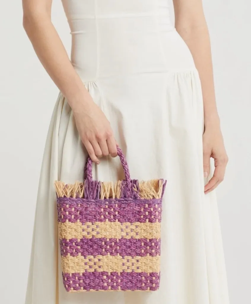 This purple and beige top handle mini tote is new with tags and never used! Plaid pattern. Fringe to... Show more