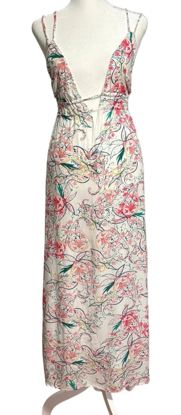 L*Space floral swim coverup. Midi length. Deep v front. Strappy open back. Lined. High side slits. Size Small. There is a slight bit of fraying at the v of the neckline (shown in last picture) otherwise in nice condition with no other noted flaws. Waist: 13” Length: 46” measured from where the strap attaches to the dress down to the bottom hem.