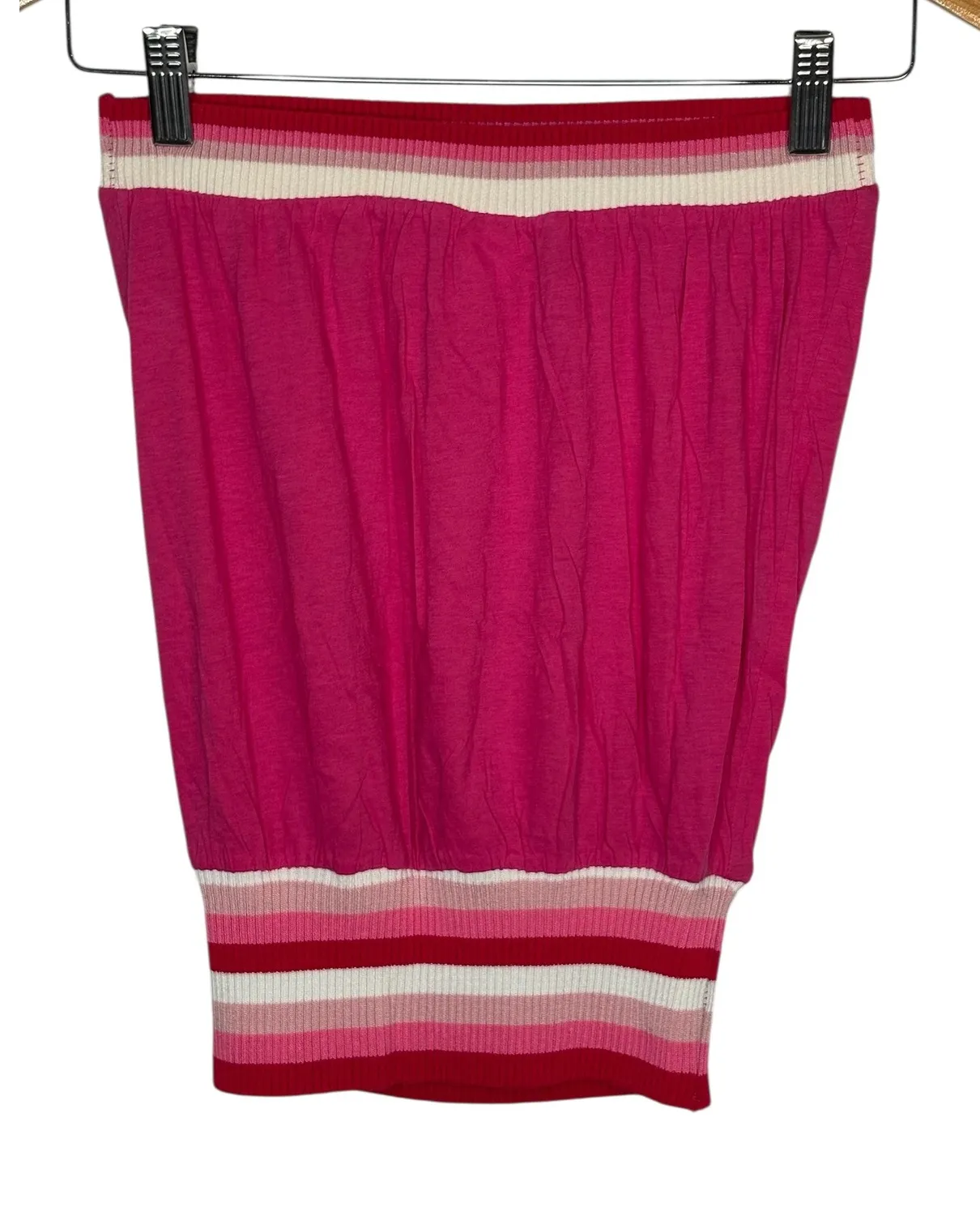 All orders shipped next business day. Lucca Strapless Tube Top Pink White Striped Banded Casual Summer Size Small Lucca strapless tube top in a vibrant pink hue. This top features a ruched body and a wide elasticized hem and neckline accented with colorful horizontal stripes in shades of white and pink. Condition: Excellent Type: Tube Top Department: Women Size: Small, Length 16.5", Pit to Pit- 11"-20" Material: Cotton Neckline: Strapless Sleeve Length: Sleeveless Keywords: strapless, tube top, pink top, striped hem, summer top, casual wear, beachwear, boho, girly, preppy, resort wear, lightweight, pullover, beach, cute A3