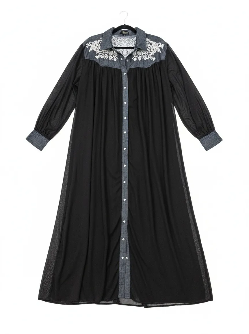 Evokes a sense of sophisticated ease in this black maxi Sheer Duster A captivating blend of modern design and western flair, it features long sleeves with buttoned cuffs and a full snap-down front, allowing for versatile styling as a dress or lightweight duster. The semi-sheer fabric lends an ethereal quality, while the denim-like detailing at the collar and cuffs adds a touch of rugged charm. Floral embroidery across the yoke infuses a delicate, romantic touch. Perfect for adding a bohemian spirit to brunch with friends, layering over a slip dress for a night out, or making a statement at a relaxed garden party. Keywords: maxi dress, long sleeve dress, embroidered dress, western style, bohemian, sheer dress, duster dress, casual dress, evening dress, party dress, boho dress, festival dress, Sheer, unique Thanks for looking!!