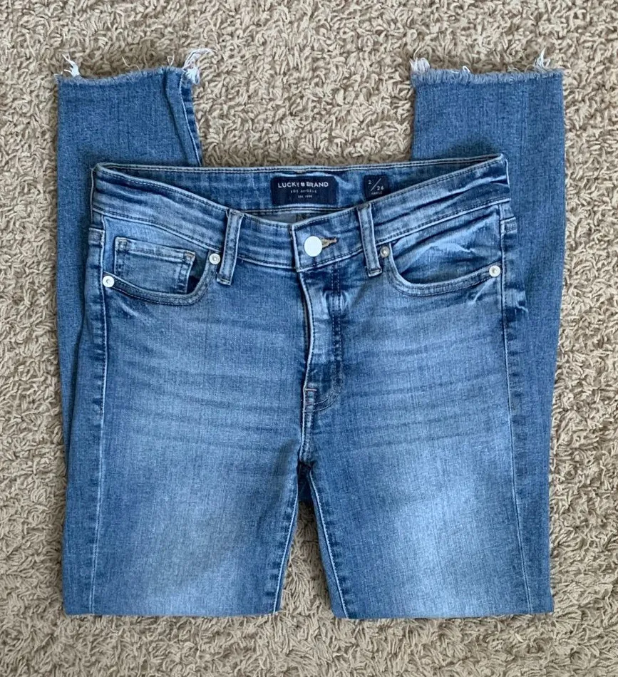 Women’s size 2/26 Lucky Brand Ava mid rise skinny raw hem ankle length blue jeans. Item is free of... Show more