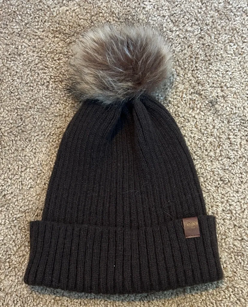 Stylish black knit beanie with a faux fur pom-pom. Ideal for keeping warm. Little to no wear