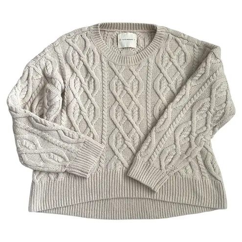 Crewneck cable knit sweater in an oatmeal beige cotton and acrylic blend with a very subtle high low... Show more
