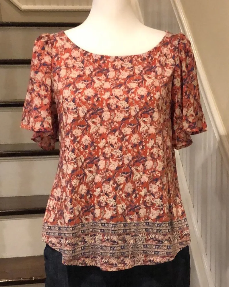 LUCKY BRAND Flutter Sleeve Rust, Navy, Ivory, Pink Floral Shirt With Floral Hem Sz Small LUCKY BRAN... Show more