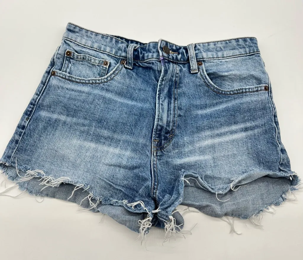 Chic light blue jean shorts with frayed hem. Perfect for casual wear. 99% Cotton, 1% Elastane