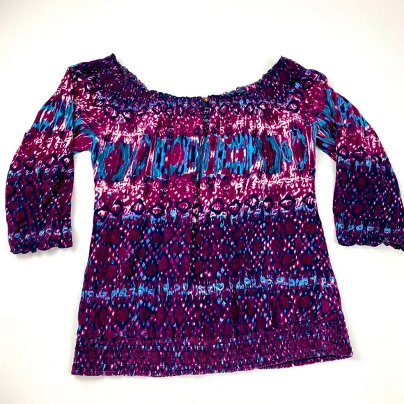 3/4 sleeve, purple blue elastic waist and collar , keyhole button front Size Medium pit to pit 17 l... Show more