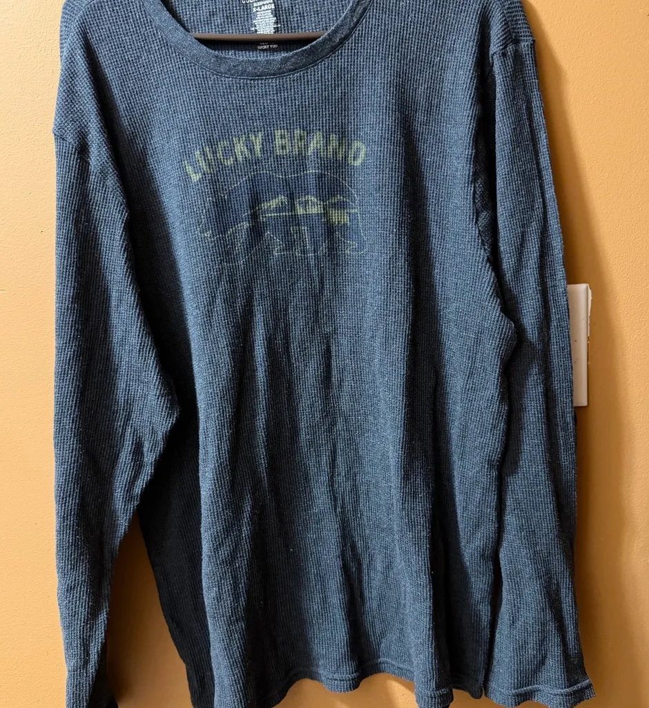 Gray long sleeve tee with graphic design. Soft and casual.lucky brand waffle knit sleep tee nightgow... Show more