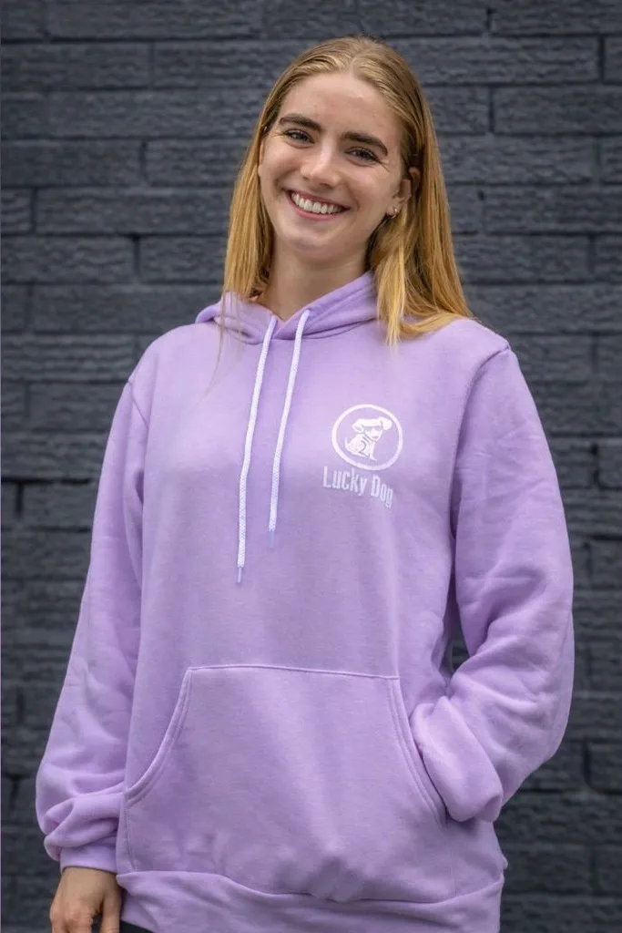 Lucky Dog, Lucky Dog Surf Co, lavender hoodie, purple hoodie, surf hoodie, beach hoodie, pullover hoodie, graphic hoodie, logo hoodie, coastal style, beachwear, vacation outfit, casual hoodie, fleece hoodie, kangaroo pocket, women’s hoodie, medium hoodie, NWOT hoodie