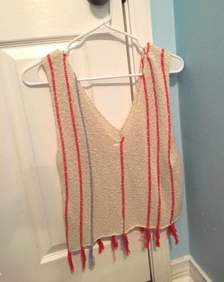 Oatmeal top with blue and orange stripes. Also has orange and blue tassels on the end. Perfect for A... Show more