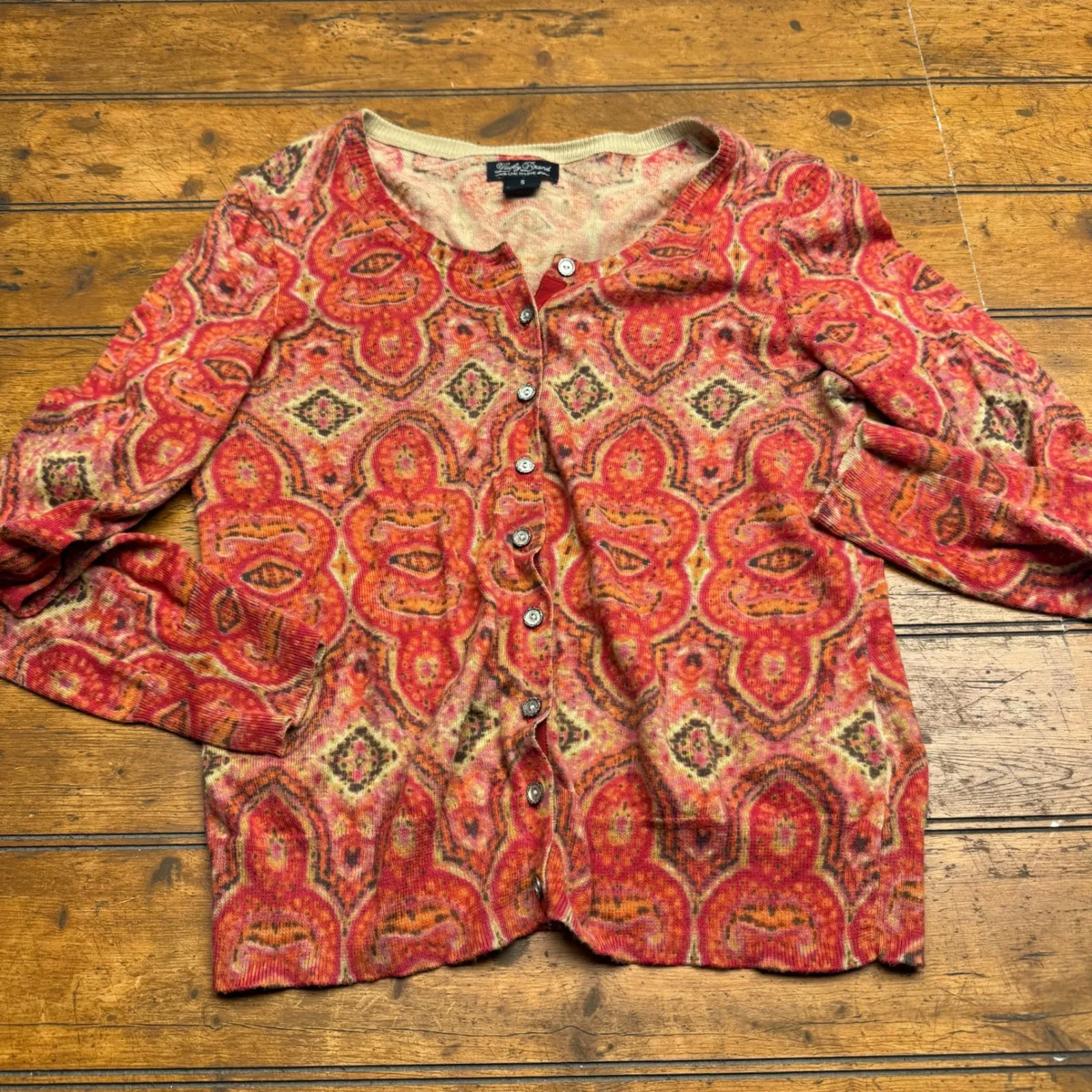 A vibrant Lucky Brand button-up cardigan sweater in size small. This piece showcases a captivating p... Show more