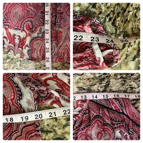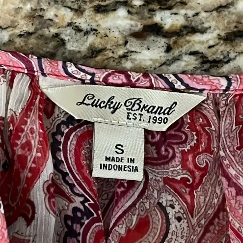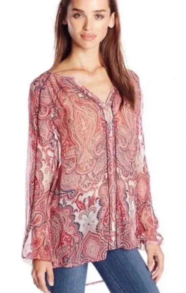 Bring effortless boho charm to your wardrobe with this Lucky Brand sheer paisley tunic top in size Small. Features a flowy, oversized silhouette with long sleeves, a relaxed peasant neckline, and a colorful red-pink pattern that works beautifully for beachy, coastal, western, and everyday casual looks. Lightweight and semi-sheer—perfect for layering over a cami or bralette. Ideal for festival styling, rodeo nights, coastal vacations, or grunge-meets-boho streetwear.