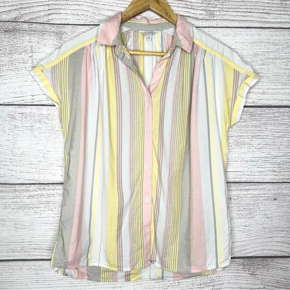Lucky Brand Pink & Yellow Striped Button-Up Short Sleeve Casual Top Women’s Size Small Cotton/Moda... Show more