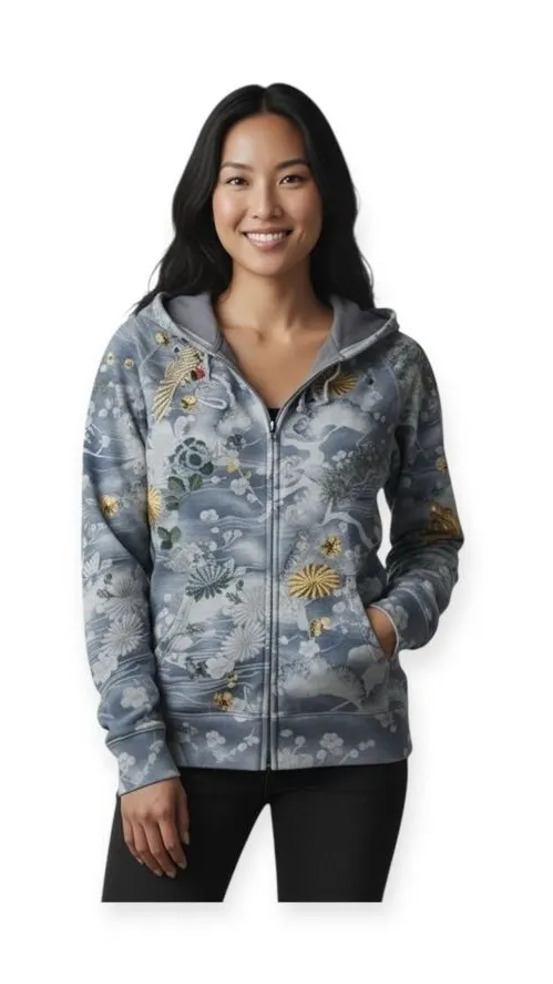 Rare: Lucky Brand Intricately Embroidered Asian Crane Zipper Hoodie Sweatshirt in Cloud Blue Size... Show more